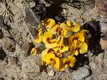 Mirbelia baueri is a low shrub, between 20 and 50 cm tall found in New South Wales, Australia. Sometimes seen in the form of mats on the heathland floor. Typical of many of the Australian pea plants, yellow and red flowers form in late winter or spring. Flowers are 10 to 12 mm long, forming from the leaf axils near the end of the branches. Leaves are thin, rigid and pointed, around 15 mm long.[1] The fruit pod is somewhat round in shape, around 6 mm long, with a beak shaped point.