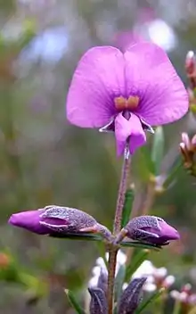 Mirbelia speciosa is a small plant in the pea family found in eastern Australia. It features relatively large purple flowers in winter and spring. Leaves form in groups of three.