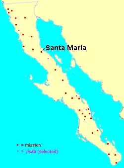 After the establishment of Mission San Fernando Velicatá, Santa María was reduced to the status of a visita, or subordinate mission station. The visita was abandoned in 1818. Ruined structural walls and rock corrals survive at the site.
