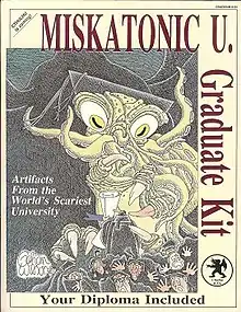 Miskatonic U. Graduate Kit is a boxed collection of "memorabilia" from the fictional Miskatonic University of H.P. Lovecraft's Cthulhu-mythos short stories. Designed by Sandy Petersen and Lynn Willis, the kit contains: