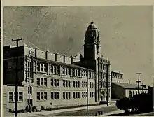 In 1922, the original Mission High School was destroyed by fire.[8] The present Mission High School complex was then constructed in a California Churrigueresque style between 1925 and 1927, during the height of San Francisco's "Golden Age" of school construction. John W. Reid, Jr., San Francisco's City Architect, was the designer.[9] The elaborate ornamentation on the school is likely due in part to the visual proximity to the nearby Mission Dolores Basilica, which features towers and ornamentation in the Churrigueresque architectural style.