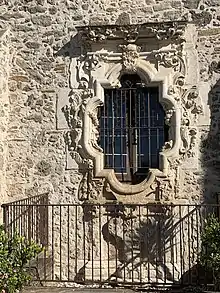 The church facade features from the top: a cross, representing Jesus Christ, St. Joseph (San José) holding the infant Jesus, St. Dominic and St. Francis, Our Lady of Guadalupe (the Virgin Mary), and St. Joachim and St. Anne holding the infant Mary. Located at the south wall of the church sacristy is the Rose Window. Sculptor and significance of the Rose Window is unknown. According to folklore, the window was sculpted by a Spanish master craftsman and artist Pedro Huizar[5] and dedicated it to his sweetheart Rosa who, on her way from Spain to meet with Pedro, lost her life at sea. The Rose Window was sculpted in 1775 and is an example of Baroque architecture in America.[6]