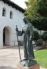 In 1970 the Mission was recognized as the center of the City of San Luis Obispo, with the dedication of Mission Plaza.[12] Mayor Ken Schwartz worked with students from Cal Poly to develop a plan to convince voters to close Monterey Street in front of the mission.[17] Construction of a plaza began in 1969 and the plaza was dedicated in 1970.[17] A statue of Junípero Serra was installed on the grounds facing the public Mission Plaza. The attention to the statues of Junípero Serra expanded during the George Floyd protests to include monuments of individuals associated with the controversy over the genocide of indigenous peoples in the Americas. The statue was moved into storage on the grounds in 2020.[18][19]