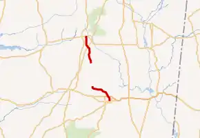 Two years later, the road was rerouted into Houston, and a small section near Montpelier was paved.[21][23] The entire route was paved in asphalt by 1971.[24][25] The two segments were connected by 1992 with a new route between MS 50 and MS 46.[26][27] In May 2000, the section from the Clay–Oktibbeha county line to Montpelier was removed from the state highway system, and it was turned over to the Board of Supervisors of Clay County.[28] By 2004, a bypass around Starkville was completed,[29] and US 82 and MS 25 were rerouted onto the new highway. A new interchange was built at MS 389 as a result, and the southern terminus of the southern segment was changed to MS 182.[30][31]