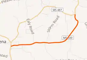 The route starts at a three-way junction with MS 13 in Lena, just south of MS 13's intersection with MS 487. Known as Lena and Walnut Grove Road, it travels eastward through the town. The route leaves the corporate limit of Lena past Lyle Street and enters a forested area at Ealy Road.[2][3] After intersecting Storm Road, the route crosses Sweetwater Creek and begins to turn northeastward near Drystone Road. MS 500 turns north northeast of Union Ridge Road. It shifts westward slightly near Lindsey Road, and it crosses a stream that leads to a drainage ditch.[4] The route emerges out of the forest and ends at MS 487 in Tuscola.[3] The road continues northward as MS 487,[4] and it travels north to MS 35 and onward to Sebastopol.[3]