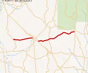 MS 540's eastern segment begins at a T-intersection with MS 149 southeast of downtown Mendenhall, but still within the city limits. The road heads northeast and almost immediately intersects U.S. Route 49 (US 49), a divided highway. It changes to a more easterly course making severa; reverse curves as it heads through wooded areas. At the community of Martinville, the road reaches a four-way all-way stop intersection with MS 541. Immediately past this intersection, state maintenance of MS 540 ends and the road is county maintained for the next 0.2 miles (0.32 km).[3][4] Continuing east, MS 540 heads through a mix of woods and open fields passing some houses along the way. The road curves to the northeast and enters Smith County. At the community of Traxler, the road heads through more rolling hills, passes a few churches, and crosses Oakohay Creek. MS 540 enters the city of Raleigh and shortly after crossing into city limits, state maintenance again ends.[3][5] Heading past small houses, the highway, known as Cohay Road, heads east. Before reaching MS 35, the road makes a sharp curve to the north and then ends at a skewed intersection with MS 35.[6]
