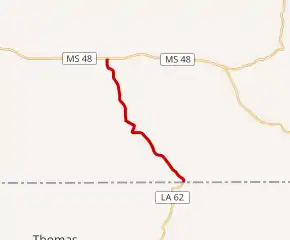 As of 1965, all of the route was in Walthall County.[2] The route started at the Louisiana state line, where Louisiana Highway 62 (LA 62) ended. MS 577 quickly turned northwest on Old State Line Road. The route continued to travel in the same direction until it reached Old Settlement Road, where it bent westward, then northward. MS 577 then turned north onto Dexter Road, and continued to shift west.[1] It ends at MS 48 at a T-intersection, about seven miles (11 km) from the state line. MS 577 is maintained by the Mississippi State Highway Commission, as part of the state highway system.[2]