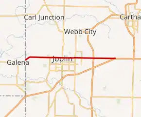 Route 66 is a fourteen-mile (21 km) long road in southwest Missouri, USA, which had previously been U.S. Route 66 for its final six years. The highway begins at Interstate 44, passes through Duenweg, Duquesne, and Joplin, then crosses into Kansas becoming K-66.
