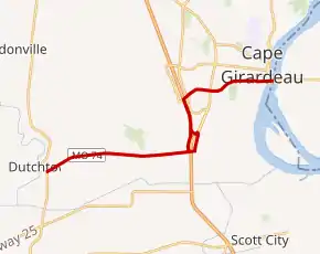 Route 74 is a highway in Cape Girardeau County, Missouri. The western terminus is at Route 25 in Dutchtown. Its eastern terminus is at the Illinois state line at the Mississippi River at Cape Girardeau. The road continues into Illinois as Illinois Route 146. No other towns are on the route.