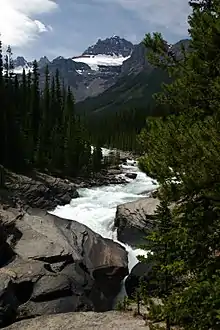 Mistaya Canyon is a canyon in the western part of the Canadian province of Alberta. It is formed by the Mistaya River. Tourists who are visiting Banff National Park often visit it because of its distinctive curvy canyon walls and because it is easy to access, being just off the Icefields Parkway. The 0.5 km trail to the canyon is located at a large parking area on the west side of the Parkway, part way up the long hill south of the North Saskatchewan River. There are actually two such parking areas on the hill; the Mistaya one is clearly marked by signs on the highway and at the beginning of the trail. The trail is an easy walk in summer but too steep for wheelchairs. The canyon is deep and there are no railings. The trail is icy in early spring.