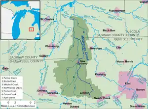 Misteguay Creek is a tributary of the Flint River, 38.4 miles (61.8 km) long,[4] on the central Lower Peninsula of Michigan in the United States. The stream drains an area of 174.4 square miles (452 km2)[5] in predominantly agricultural areas of the Flint/Tri-Cities region. Via the Flint and Shiawassee rivers, it is part of the watershed of the Saginaw River, which flows to Saginaw Bay of Lake Huron. Via Lake Huron and the Great Lakes system, it is part of the larger watershed of the St. Lawrence River.