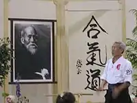 At the age of 16, Mitsugi Saotome began his martial arts training in judo. At the age of 18, he entered the Aikikai Hombu Dojo in Tokyo in order to train under Ueshiba. Records provided personally from Kisshomaru Ueshiba, to the Saotome family from Hombu Dojo, detail a first degree black belt in 1957, and second degree black belt in 1958.[3] Kisshomaru Ueshiba goes on to confirm that Mitsugi Saotome became an uchi-deshi (personal apprentice or disciple) to Morihei Ueshiba in April of 1959, receiving subsequent promotions to sixth degree black belt (Shihan) in January 1968, and remained uchi-deshi until the founder's death in April 1969.[3] Mitsugi Saotome trained at Hombu Dojo for a total of 15 years.[4][5]