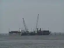 The island is protected by 11-metre-high (36 ft) sheet piling measures at 70 by 95 m (230 by 312 ft). The western section of the field includes 18 production wells. The first oil came onstream in 1987 and was delivered ashore on 45 by 18 m (148 by 59 ft) double hull barges. A new redevelopment plan included the construction of a land-based facility in Dieksand from which 2,000–3,000 m-long (6,600–9,800 ft) extended-reach production wells[4] were to tap into the eastern part of the field. As per the development program, a pilot well and seven high-tech extended-reach wells measuring at 7,727 m (25,351 ft), 8,284 m (27,178 ft), 8,367 m (27,451 ft), 8,995 m (29,511 ft), 9,275 m (30,430 ft), 8,450 m (27,720 ft), 8,672 m (28,451 ft) and a 4-kilometre (2.5 mi) section cutting through the Büsum salt diapir were to ensure a faster exploitation of the field. The redevelopment plan also included construction of 7.5 km (4.7 mi) pipelines from the island to Friedrichskoog-Spitze and a 2.8 km (1.7 mi) pipeline to the Dieksand Land Station. This was expected to enable the Mittelplate consortium to transport up to 1 million tonnes or 7,550,000 barrels (1,200,000 m3) of oil a year.[5] Oil is pumped ashore and water extracted during processing is then routed back by the second pipeline for reinjection into the lower section of the reservoir. The modified island facility now contains living accommodation for up to 96 people.[1][6]