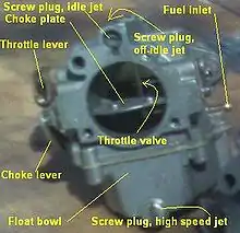 Constant vacuum carburetors, also called variable choke carburetors and constant velocity carburetors, are carburetors where the throttle cable was connected directly to the throttle cable plate. Pulling the cord caused raw gasoline to enter the carburetor, creating a large emission of hydrocarbons.[29]