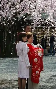 Miyamairi (宮参り, literally "shrine visit") is a traditional Shinto rite of passage in Japan for newborns. Approximately one month after birth (31 days for boys and 33 days for girls[1]), parents and grandparents bring the child to a Shinto shrine, to express gratitude to the deities for the birth of a baby and have a shrine priest pray for his or her health and happiness. The practice is similar to a Christian infant baptism.