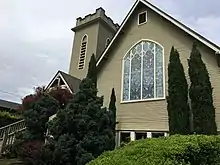 The wood-frame structure features a Carpenter Gothic style drawing from the mid-1800s. Above the prominent entryway staircase rises a Basilican bell tower adjacent to the main structure.[2] The facade of this main structure contains the largest of the ten stained glass windows around the building, this window captivating visitors with a vibrant color and design that stands out from the neutral-colored wood.