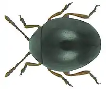 Mniophila muscorum is a species of Chrysomelid in the sub-family Galerucinae, that can be found nearly everywhere in Southern Northern Europe , Central Europe and East Europe and also in Italy it is not recorded in Turkey or the Caucasus and it is doubtfully recorded in Spain[1]