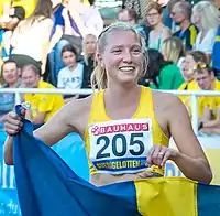 Moa Elin Marianne Hjelmer (born 19 June 1990) is a Swedish athlete who competes in the 200 metres and 400 metres. Hjelmer was born in Stockholm. She won a silver medal in the Junior European Championships in 2011 in Ostrava. She beat the Swedish record time on 400 metres on 14 August 2011, then beat it twice during the European Championship in Helsinki in 2012.[1] On 29 June 2012 she won a gold medal at the 2012 European Athletics Championships in Helsinki when she won the 400 metres final on a new Swedish record time of 51.13 seconds. She had set the previous record time at the previous day's semi final race.[2]