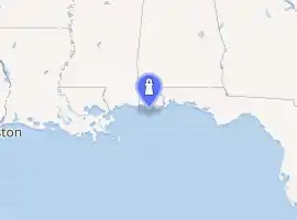 The Mobile Point Range Lights were a series of lighthouses at the entrance to Mobile Bay, at Mobile Point on the tip of the Fort Morgan peninsula, near Mobile, Alabama, United States. The first lighthouse was built as a landfall light by June 1822 at a cost of $9,995.[1] The lighthouse was a conical brick masonry tower, 40 feet (12 m) tall. It was first lit on 29 September 1822. Fort Morgan was built adjacent to the lighthouse in 1833. The lighthouse was joined by the 200-foot (61 m) Sand Island Light across the mouth of the bay, about 3 miles (4.8 km) away in 1858. This resulted in the Mobile Point Lighthouse being downgraded to a harbor light, at the same time a fourth order Fresnel lens was installed. A period photograph (see infobox), taken prior to the American Civil War, shows two shorter masonry towers standing on the beach below the main tower, they served as range lights.[1] The lighthouse was subsequently destroyed by cannonball fire in the Battle of Mobile Bay during the Civil War.[2]