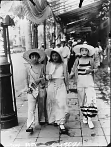 Moga were Japan's equivalent of America's flappers, Germany's neue Frauen, France's garçonnes, or China's modeng xiaojie (摩登小姐).[1] By viewing moga through a Japanese versus Western lens, the nationalist press could use the modern girl archetype to blame such failings as frivolity, sexual promiscuity, and selfishness on foreign influence.[2] The period was characterized by the emergence of working class young women with access to money and consumer goods. Using aristocratic culture as their standard of Japaneseness, the critics of the modern girl condemned her working class traits as "unnatural" for Japanese. Modern girls were depicted as living in the cities, being financially and emotionally independent, choosing their own suitors, and apathetic towards politics.[3] The woman's magazine was a novelty at this time, and the modern girl was the model consumer, someone more often found in advertisements for cosmetics and fashion than in real life. The all-female Takarazuka Revue, established in 1914,[4] and the novel Naomi (1924) are outstanding examples of modern girl culture.