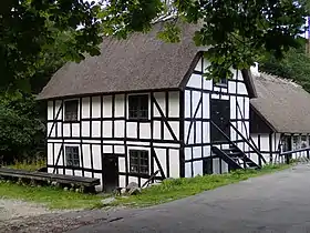 The mill appears as it did after the last major changes in 1852. The mill itself is from 1785 although the first floor was added in 1852. The farmhouse was built in 1824.[2] The mill is built on a base of boulders with half-timbered walls and gables. The roof is thatched with straw and the milling equipment is in almost original condition.[3]