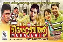 Mohabbath is a 2011 Malayalam–language musical romance film directed and produced by East Coast Vijayan. It stars Meera Jasmine, Munna and Anand Michael in the lead roles. Written by Siddique Shameer based on his own novel Kalippavakal, the film features music by S. Balakrishnan, who makes his comeback through this film. Renowned singer Hariharan appears as himself in a song sequence while Roma does a cameo role.