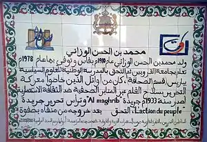 Mohamed Belhassan Wazzani was born in 1910 in Fez, and grew up in his hometown, studying at the University of al-Qarawiyyin. In 1927, he went to Paris to pursue his studies in political sciences. In 1933, he founded the nationalist French-speaking newspaper L'Action du Peuple, which was the first anti-colonial French-speaking newspaper in Morocco.[1]