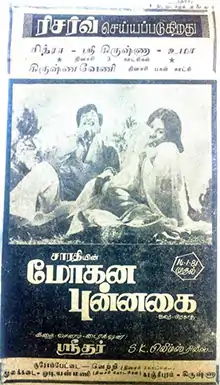 Mohana Punnagai (transl. The seductive smile) is a 1981 Indian Tamil film, directed by C. V. Sridhar and produced by R. P. Sarathy. The film stars Sivaji Ganesan as lead actor with Geetha (Sri Lanka actress), Jayabharathi, Padmapriya, Anuradha and Anandhi as lead actresses. The film had musical score by M. S. Viswanathan.[1][2][3]