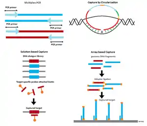 Gene selector method:[15] An initial multiplex PCR step is performed to enrich the targets of interest. The PCR products are circularized upon hybridization to target-specific probes with sequences complementary to the two primers used in the PCR step.