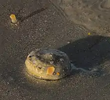 These ascidians have soft bodies but are covered by a hard, protective tunic as they are part of the subphylum tunicate. They are sessile intertidal organisms.[3] The tunic contains hair like extensions of the epidermis known as ampullae, which are hollow and tubular.[4] Ampullae grow shortly after the larvae settles in the sediments and are used to form a strong attachment to grains of sand.[5] The grains of sand hold it down as the juvenile forms around seven to nine ampullae to create a secure attachment to soft sediments or hard substrates surrounding the organism.[4] Adult M. occidentalis cover themselves in a layer of sand and use the ampullae to secure the sand on top of them in order to camouflage and protect them from predators.[3]