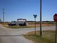 Located in Mollie next to the intersection of the two county roads is a railroad line. This line was authorized in 1849, and connects the Indiana cities of Fort Wayne and Muncie—running through the Blackford County communities of Montpelier, Mollie, and Hartford City (see railroad map).[26] Although work constructing the railroad line began in the 1850s, it was not completed (by connecting Fort Wayne to Muncie) until 1870.[26] The original company was named Fort Wayne & Southern Railroad Company, but by the time the railroad began operations, it was named Fort Wayne, Cincinnati & Louisville Railroad. (Most of the "Louisville" part of the name can be seen on the railroad map herein.)[26] The Lake Erie and Western Railroad acquired the Fort Wayne, Cincinnati & Louisville Railroad in 1890, and both names were used to describe the railroad during Mollie's more prosperous years.[27][28] A short piece of railroad track branched off from the main line to enable the loading and unloading of railcars in Mollie. The Mollie "loading track" was listed in 1895 as having a length of 361 feet (110 m).[29] Another short branch line, the 800-foot (240 m) Manhattan Oil spur, was located nearby. Although these branch lines have been removed, trains still operate over the main line.