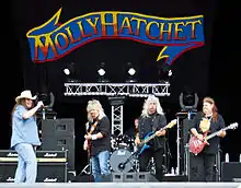 Molly Hatchet is an American rock band formed by guitarist Dave Hlubek in Jacksonville, Florida, in 1971. They were a popular band during the late 1970s and early-to-mid 1980s among the Southern rock and hard rock communities.[1] The band released six studio albums on Epic Records between 1978 and 1984, including the platinum-selling hit records Molly Hatchet (1978), Flirtin' with Disaster (1979) and Beatin' the Odds (1980).[2] They also had successful hits on the Billboard charts, including "Flirtin' with Disaster", "The Rambler", "Bloody Reunion" and "Satisfied Man".[3] Molly Hatchet has released eight more studio albums since their split with Epic in 1985, although none of them have been as successful as their early albums, nor charted in the United States.