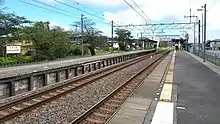 This station consists of two side platforms serving two tracks, connected to the station building by a footbridge.