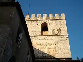 - The Main or bell tower is of rectangular form, whose walls are made with ashlar masonry. The tower is divided in four parts by means of moldings. The bell was in the last floor. It has four pointed arcs that finishes with battlements. The inaugural stone is placed in this tower, it is written with Gothic letters and in old Valencian.