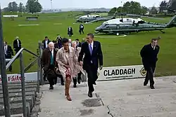 U.S. President Barack Obama and his wife Michelle visited Moneygall on 23 May 2011. The President's entourage faced gale-force winds to fly from the Phoenix Park in Dublin in two Chinook and two Black Hawk helicopters. The violent winds exceeded normal conditions for helicopter flying, and some passengers became sick during the 40 minute trip. The party landed in St. Flannan's Park in wet and blustery conditions. One of the President's advisers was felled by a blast of wind and papers she was carrying were scattered across the hurling pitch, pursued by Gardaí.[1][2][3]