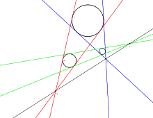 In geometry, Monge's theorem, named after Gaspard Monge, states that for any three circles in a plane, none of which is completely inside one of the others, the intersection points of each of the three pairs of external tangent lines are collinear.
