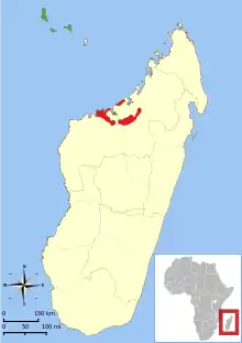 | Distribution of E. mongoz:[1]red = native, green = introduced | |