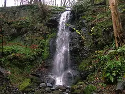 A rocky glen runs up from Monkcastle with a significant waterfall and a listing as part of a Scottish Wildlife Trust local site for nature conservation. The glen was partly formed from quarrying work for freestone.[33] A previous course of the Monkcastle Burn can still be followed and this probably resulted from the quarrying intruding into the original course of the burn at the head of the glen resulting in a waterfall and the burn then following the bed of the glen itself. The geology consists of Carboniferous limestone, macroporphyritic basalt, and an overlay of basalt and boulder clay. The quarry workers are thought to have made used of Old Monkcastle as office space for storage, etc. The OS maps show that quarrying had ceased by the start of the 20th century.[33]