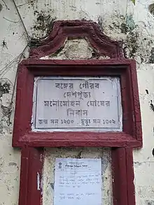Manmohun Ghose (Bengali: মনমোহন ঘোষ Mônmohon Ghosh) (also spelt Monomohun Ghosh, Manmohan Ghosh) (13 March 1844 – 16 October 1896) was the first practicing barrister of Indian origin.[1][2] He is notable for his contributions towards the fields of women's education, for arousing the patriotic feeling of his countrymen and for being one of the earliest persons in the country in organised national politics.[3] At the same time his Anglicised habits often made him a target of ridicule in Calcutta.[4]