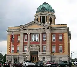 The Monroe County Courthouse is located in Woodsfield, Ohio and is one of few courthouses located in a town square. It is the fourth courthouse building on this site, with two of the previous ones destroyed in fires.[2] The present building is of red brick with yellow brick quoins, pillars and pediments, which are said to represent the colors of fall in the surrounding countryside. The main entrance is reached by a small flight of stairs between Ionic columns and a pediment of fine arched stone.