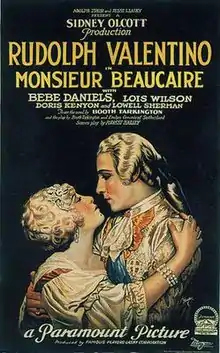 Monsieur Beaucaire is a 1924 American silent romantic historical drama film starring Rudolph Valentino in the title role, Bebe Daniels and Lois Wilson. Produced and directed by Sidney Olcott, the film is based on Booth Tarkington's 1900 novel of the same name and the 1904 play of the same name by Tarkington and Evelyn Greenleaf Sutherland.[1]