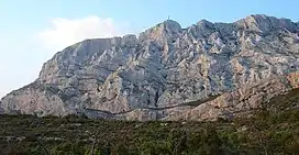Montagne Sainte-Victoire (Provençal Occitan: Venturi / Santa Venturi according to classical orthography and Ventùri / Santo Ventùri according to Mistralian orthography) is a limestone mountain ridge in the south of France which extends over 18 km (11 mi) between the départements of Bouches-du-Rhône and Var. Its highest point is the Pic des mouches at 1,011 metres (3,317 ft); this is not however the highest point in Bouches-du-Rhône, which is instead found in the Sainte-Baume massif. The Croix de Provence is a notable feature of the mountain. At a height of 19 metres, this cross, although not placed at the highest point of the mountain, stands out from the ridge far more than the Pic des Mouches.