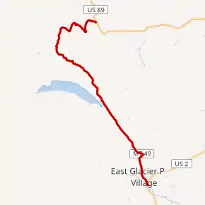 Highway 49 (MT 49) in the U.S. State of Montana is a route running in a northerly direction from a junction with U.S. Route 2 in the town of East Glacier Park. The highway extends approximately 12 miles (19 km) to an intersection with U.S. Route 89 at a location known as Kiowa. Highway 49 is near the southeastern corner of Glacier National Park, and is heavily used by tourists during the summer months. A spur road heading west from Montana 49 four miles (6 km) north of East Glacier provides access to the Two Medicine area of the park.[2]