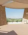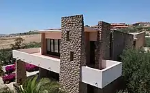 The buildings are characterised by organic, curved monopitch roofs of white-plastered concrete, which stand out against angular walls of raw natural stone. Right angles are rare. In this way, the ensemble refers to Ricci's teacher Giovanni Michelucci and the style of Frank Lloyd Wright on the one hand[3] and connects to the Sicilian landscape on the other hand, because the natural stone used in the walls was sourced in the immediate vicinity.