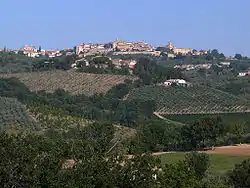 Montefalco is a historic small hill town in Umbria, Italy, with a population of 5,581 in August 2017. It has been settled since pre-Roman times, and retains many of its historic buildings. From 1446 to 1861 it was part of the Papal States. Montefalco DOC is a regulated geographical area for its wine, the reds usually including the highly localized Sagrantino grape variety. The town's museum is in a former church, which has a fresco cycle on the life of St. Francis by the Florentine artist Benozzo Gozzoli (1450–1452).