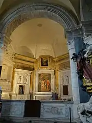 The funeral monument of Cardinal Antoniotto Pallavicini on the left wall was made by the Bregno workshop. It was originally set up in the apse of the Old St. Peter's Basilica but a Dutch traveller, Aernout van Buchel glimpsed it in 1587 among various other discarded tombs and sculptures in the nave due to the ongoing demolition of the ancient church.[3] According to the inscription on the sarcophagus "always having death in mind, Antoniotto Cardinal of S. Prassede, erected [this tomb] for himself while still alive, in the year 1501". The monument was restored and transferred to the choir of the Basilica of Santa Maria del Popolo by his great-nephews in 1596 to which date the longer inscription on the base belongs.[4] At the same time the Pallavicini family erected another tomb in the right aisle for a long deceased member of their house, Cardinal Giovanni Battista Pallavicino. The tomb of Antoniotto has been moved into the baptistery at an unknown date (but later than 1629) after temporary stay in the Chigi Chapel nearby.