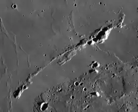 The selenographic coordinates of this range are 29.06°N 54.07°W. It continues for a distance of 160 kilometres. This range is a long, slender ridge formation that is more rugged at the northeastern end. There is also a rise at the southwest terminus of the range. The faint trace of a ray parallels the range just to the north. The 20 km gap between this range and the plateau to the south is covered by a flow of basaltic lava. There is a small wrinkle ridge near the northern part that is identified as Dorsum Niggli.