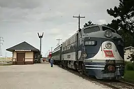 ![]() A museum tourist train, being led by Wabash Railroad F7A #1189, rests in front of the Nelson's Crossing depot. | |