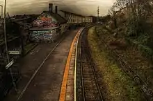 In 2004, the Severnside Community Rail Partnership was formed, covering the Severn Beach Line and a network of routes radiating from Bristol.[19] By 2008, they had created a support group for the station, were helping with station upkeep, and had improved the provision of timetabling information through the use of simplified departure timetable posters.[10] In 2007, they repainted the mural on the old station building, but it was defaced by vandals the same year. First Great Western offered a £500 reward for identifying the persons responsible, and stated they planned to install CCTV cameras.[34] Students from Fairfield High School repainted the mural with help from professional graffiti artist Richard Minchin.[35] Artist Wei Ong repainted the mural in 2015, and it was repainted again in 2017 by street artist Silent Hobo.[12][36] Customer help points with next train information screens were installed during 2008/09, paid for by money from the Department for Transport's "Access for All" fund and local councils.[37] The help points were stolen in early 2010, but have since been replaced.[2][38][39] A large number of trees north of the station, which had provided noise mitigation and stabilised the embankment, were felled in 2018 by local residents, without permission from Network Rail.[40][41]