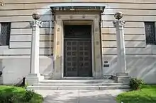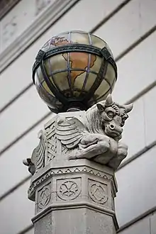 The façades on Sherbrooke and St-Marc streets and are covered with Queenston limestone. The main facade, on Sherbrooke, has a base made of rusticated limestone and features four openings as well as a prominent central entrance, flanked by two free-standing columns topped by terrestrial and celestial spheres. The main door is made of detailed architectural bronze. A decorative belt course defines the upper part of the base and consists of ornamental carving and words in relief: FIDES, VERITAS, CARITAS, LIBERTAS, SPES ("Faith", "Truth", "Charity", "Liberty", and "Hope" in Modern English).